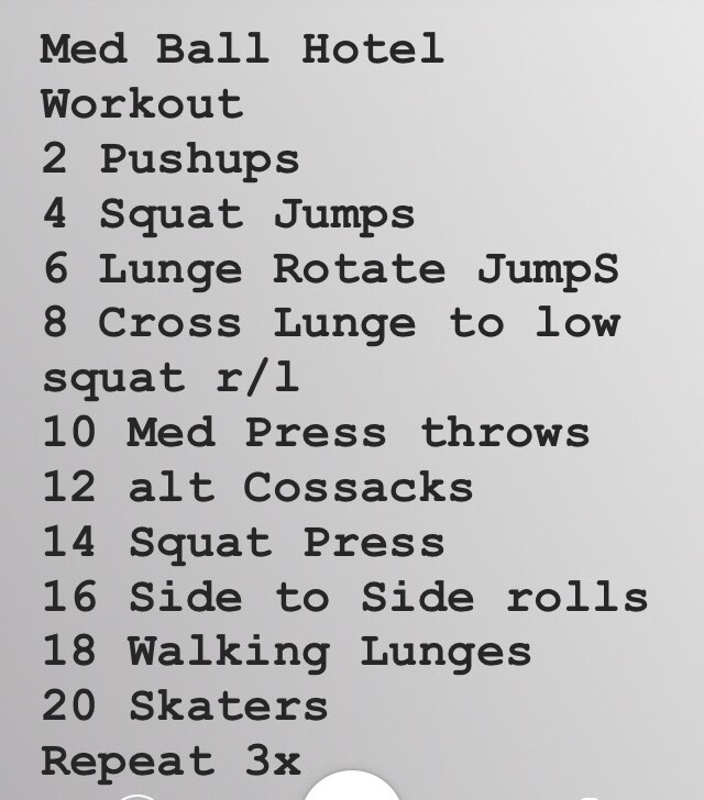 So today I took it on as a challenge after finding out that Med Balls were the only resistance equipment available. After a quick foam roll and warm up, I wrote out a plan….